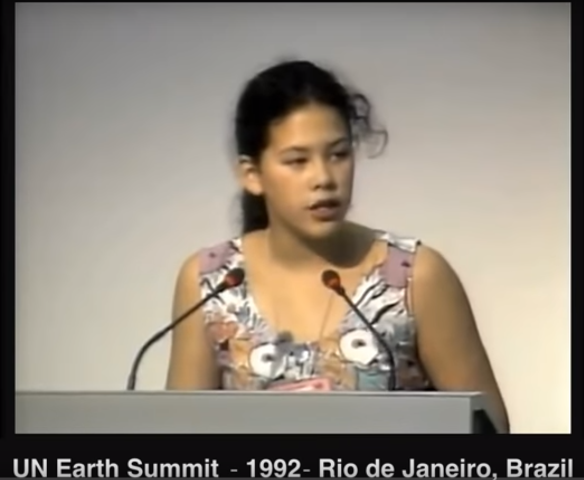 “햇볕 아래 가는 게 두렵다. 오존 구멍들 때문이다. 공기를 마시는 것도 두렵다. 어떤 화학물질이 있는지 모르기 때문이다. 아빠와 함께 밴쿠버에서 낚시를 나가곤 했다. 몇 년 전 온통 암에 걸린 물고기들을 발견하기 전까지 이야기다. 동물과 식물이 매일매일 멸종되고 있다. 여러분도 내 나이에 이런 걸 걱정했었나요.”