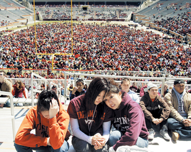 17일 버지니아공대 워샴 스타디움에서 열린 총격사건 희생자 추모제가 열리는 동안 두 여학생이 손을 맞잡고 슬품을 함께 하고 있다.