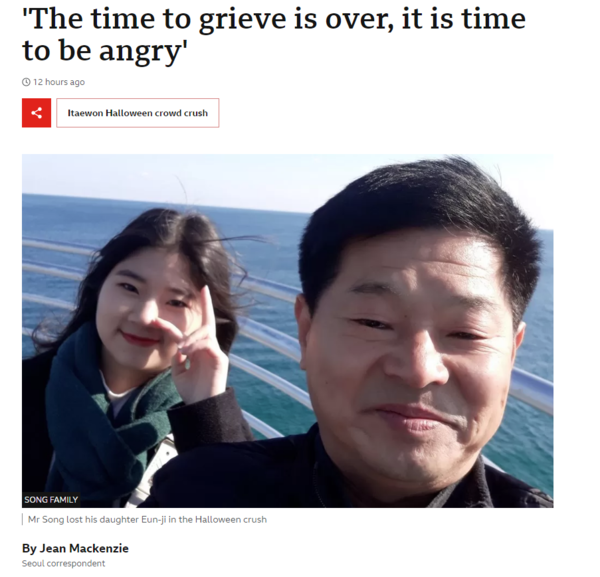 기사의 제목은 참척의 고통으로 울던 아버지가 한 말이다. 그가 슬픔 속에서 '분노'를 꺼낸 까닭은 "그들이 그 많은 인파를 예상했으면서도 아무 것도 하지 않았기 " 때문이다. "(인파를 정리할)경찰관 10여 명만 있었으면 딸이 죽지 않았을 것"이기 때문이다. 3주 가까이 지나면서 당국이 더 잘 대비하고 더 빨리 대처했으면 예방 가능한 참사였다는 사실은 갈수록 분명해진다.