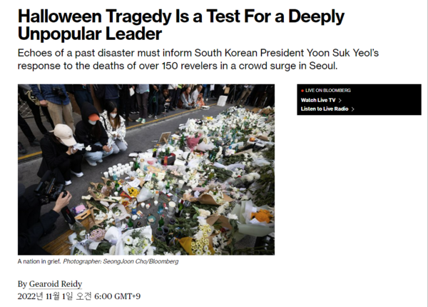 대통령의 낮은 지지율과 희생자의 대부분이 청년들인 점, 참사에 대한 지도자의 낮은 공감력 등 세가지 근거가 외신 논평의 핵심 요소들이다. 대부분의 내신과 확연히 다른 시각이다. 블룸버그 통신이 한국 시간 1일 새벽 6시 전한 기어로이드 라이디의 칼럼 '핼러윈 비극은 매우 인기가 없는 지도자에게 시험'은 BBC 매켄지 특파원과 같은 분석을 일찌감치 내놓았다.