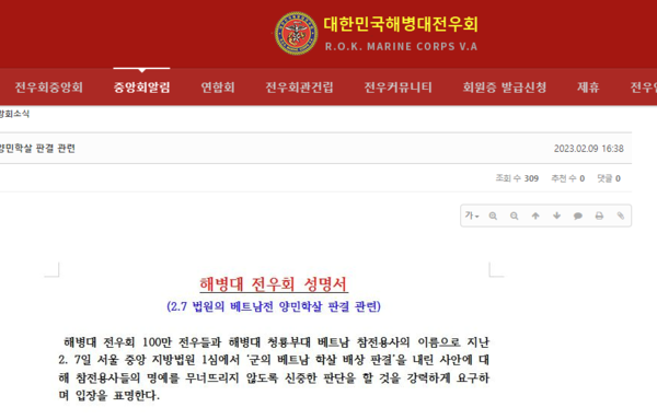(해병대 전우회는 9일 성명에서 "참전용사들의 명예를 무너뜨리지 않도록 신중한 판단을 할 것을 강력하게 요구한다"는 입장을 내놓았다. 전쟁 중 해병대 1156명의 전사자와 지금까지 후유증으로 시달리는 수많은 참전용사의 아픔을 같이하며 그들의 명예에 조금이라도 영향을 미치는 어떠한 행위도 용납할 수 없다"고 밝혔다. 대한민국 월남 참전자회도 8일 자 입장문에서 "참전자회와 국가보훈처는 국방부와 법무부 변호사에게 관련 자료를 지원하는 등 최선의 노력을 다했지만, 월남 참전 전우들과 가족들의 명예가 심각하게 실추됐다"면서 "항소심에서 최선의 결과가 나올 수 있도록 노력을 다하겠다"고 밝혔다. 대한민국 고엽제 전우회는 10일 현재 입장을 내놓지 않고 있다.)