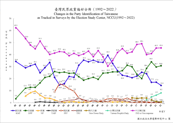 국립정치대학의 2022년 정당 지지 성향 조사를 보면, 민진당(30.8%)이 국민당(14.4%)을 두 배 이상의 격차로 압도했다. 대만민중당이 8.2%로 3위였다. 그러나 정당 지지율이 30%에 머문다는 것은 민진당 정부에 대한 불만이 팽배하다는 것을 말해준다. '중립 또는 무응답'이 45.6%에 달한 것이 이를 방증한다. 차이 총통이 미국 정치인을 만나고 조 바이든 행정부의 지지를 받는 것이 국민적 지지로 연결되지 않는 것이다.