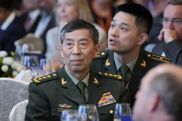 리샹푸 중국 국방 장관이 2일 싱가포르 샹그릴라 안보대화 만찬장에서 앤서니 알바네스 호주 총리의 연설을 경청하고 있다. 2023.6.2. AP 연합뉴스