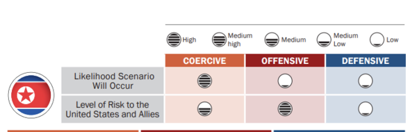 NIE는 '강압(coercive) 목적'과 '공격 목적' '방어 목적' 등 3가지 시나리오를 제시하면서 "북한이 2030년까지 증강될 핵무기의 가치와 목적을 어떻게 인식하는지를 검토했다"고 전했다. 북한은 이중 핵무기 현황을 지금까지처럼 '강압 외교'를 지지하는 데 사용할 것으로 판단한 뒤 "핵무기 및 탄도미사일 보유량과 성능이 높아지면서 갈수록 '위협적인 강압 행동'을 고려할 것이 거의 확실하다"고 짚었다. 북한의 핵무기 사용 시나리오와 북한의 핵무기 옵션이 미국과 동맹에 미칠 위협의 수준을 각각 높음(5)·중간높음(4)·중간(3)·중간낮음(2)·낮음(1) 등 5단계로 나누었다.
