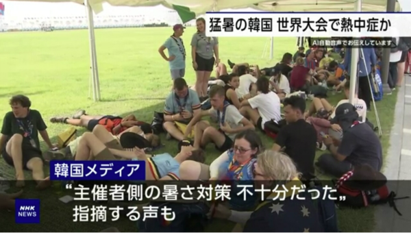 로이터 통신은 3일 35℃ (화씨 95도)에 달하는 역대급 폭염 속에서 대회 참가자들이 잇달아 쓰러지고 있다고 타전했다. 참가 학생들은 14~18세의 청소년들로 전체 4만 3000명의 참가자 가운데 최소 600여 명이 온열 질환으로 가료를 받았다고 전했다. 전라북도 소방 당국 관계자의 말을 인용해 "대부분은 두통이나 현기증, 구토 등 가벼운 증상을 보였지만 모두 캠프장으로 돌아갔다"고 전했다.
