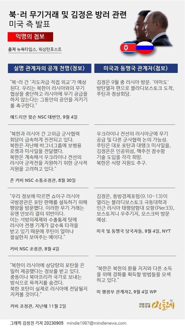 | 김정은 곧 방러, 푸틴과 정상회담? NYT '이상한 보도' (0) | 2023.09.10 |
