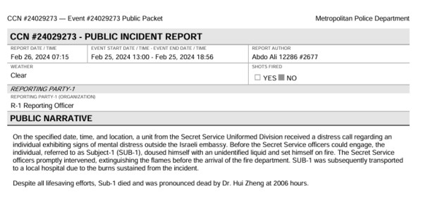 일요일인 지난 25일 오후 1시쯤, 워싱턴의 이스라엘 대사관 앞. 인화 촉진제를 뒤집어 쓴 한 미 공군 현역 병사가 이렇게 외친 뒤 불을 붙였다. 군복차림의 애런 부시넬(25)은 곧바로 병원 응급실로 옮겨졌지만, 이날 밤 끝내 사망했다. 앤 스테파네크 미 공군 대변인은 그가 현역 복무 중인 병사임을 확인했다. 26일 역시 현역 공군 소장인 팻 라이더 국방부 대변인은 "분명 비극적인 사건"이라면서 유족에 애도의 뜻을 전했다. 주미 이스라엘 대사관은 사건 발생 사실을 확인하면서 어떠한 대사관 직원도 다치지 않았다고 발표했다.