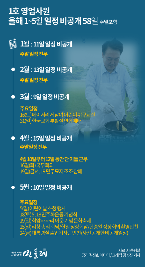 윤석열 대통령 부부의 해외순방은 작년 12월 11~15일 네덜란드 방문 이후 6개월 만이다. 순방이 없던 기간 대통령은 어떻게 지냈을까. 시민언론 민들레가 10일 대통령실 누리집 '공개일정'을 확인한 결과 올 1월부터 5월까지 공개 일정이 없는 날이 무려 58일에 달했다. 전체 161일 중 사흘에 하루꼴(36%)로 공개일정이 없었다.