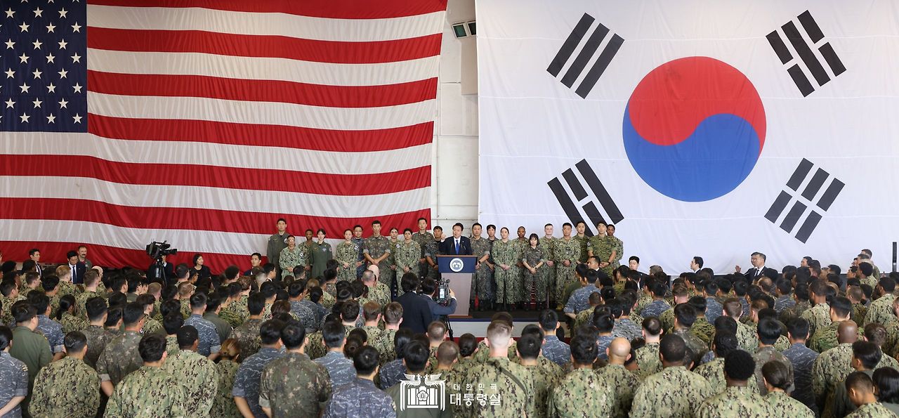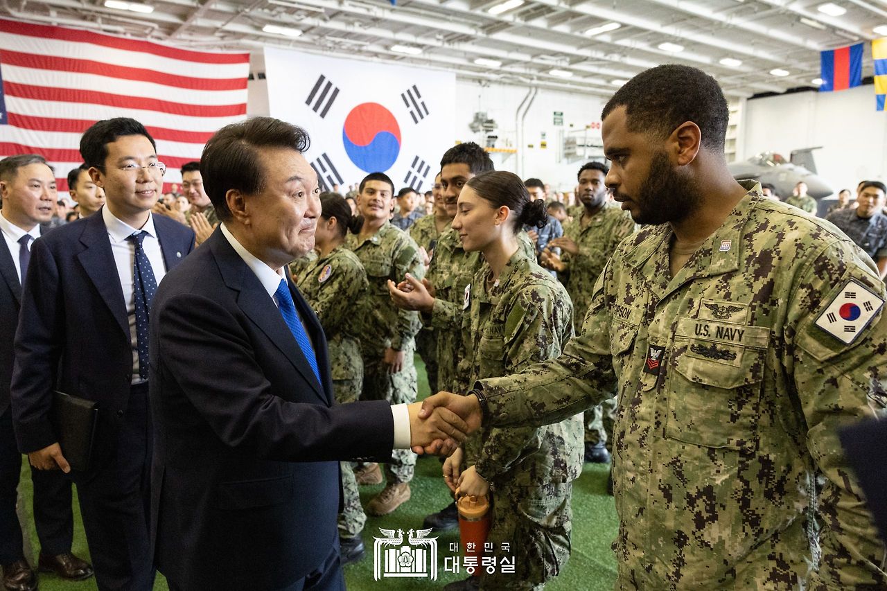 루즈벨트함 시찰을 마친 대통령은 격납고로 이동해 한미 장병 300여 명을 격려했습니다. 대통령은 이 자리에서 “이번 루즈벨트 항모 방한은 지난해 4월, 저와 바이든 대통령이 채택한 ‘워싱턴선언’의 이행 조치”라면서 “강력한 확장억제를 포함한 미국의 철통같은 대한 방위공약을 상징하는 것”이라고 설명했습니다.