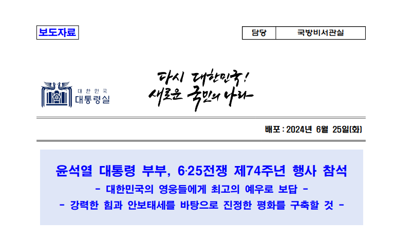 2024.06.25. 윤석열 대통령 부부, 6·25 참전 유공자 초청 위로연 참석 관련 김수경 대변인 서면 브리핑