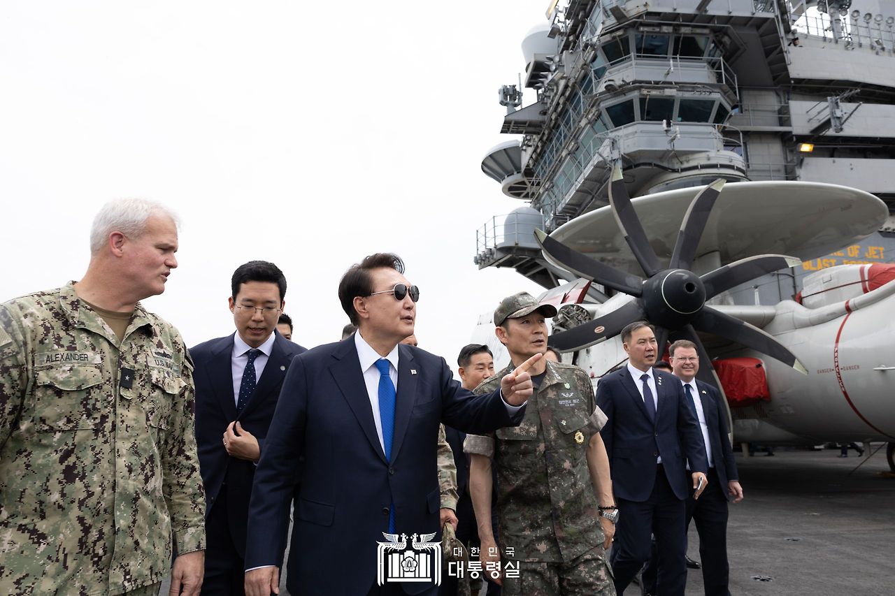 윤석열 대통령은 오늘(6. 25, 화) 오후 부산 해군작전기지에 정박 중인 미국 시어도어 루즈벨트 항공모함을 방문했습니다. 현직 대통령이 미국 항공모함에 승선한 것은 1974년 박정희 전 대통령, 1994년 김영삼 전 대통령에 이어 세 번째입니다. 이번 루즈벨트 항공모함의 방한은 지난해 4월 한미 정상이 채택한 ‘워싱턴 선언’의 이행조치로서, 강력한 확장억제를 포함한 미국의 철통같은 대한 방위공약을 상징합니다. 대통령이 루즈벨트함에 승선하자, 대통령의 승함을 알리는 종소리가 울렸습니다. 이후 임무에 따라 각기 다른 색의 옷을 입은 영송병의 구령과 함께 300여 명의 한미 장병들이 큰 환호성으로 대통령을 맞았습니다.