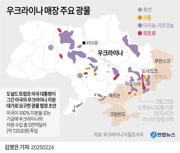 미국 지질조사국(USGS)에 따르면 우크라는 주요 희토류 보유국도 아니다. 세계 4대 희토류 광물 보유국은 중국(4400만t), 베트남(2200만t), 브라질(2100만t), 러시아(1000만t)이다. 미국의 추정 매장량은 180만t이며, 트럼프가 눈독 들이는 그린란드가 150만t이다. 우크라가 천연자원 부국인 것은 맞다. 우크라는 2021년 7월부터 유럽연합(EU)과 핵심 광물에 관한 전략적 파트너십 양해각서를 체결하고 공동개발에 나섰다. 우크라 지질조사국과 환경-천연자원부는 티타늄과 리튬, 흑연, 니켈 및 코발트 광산의 공동개발에 주력하고 있다.