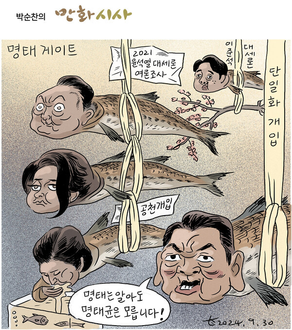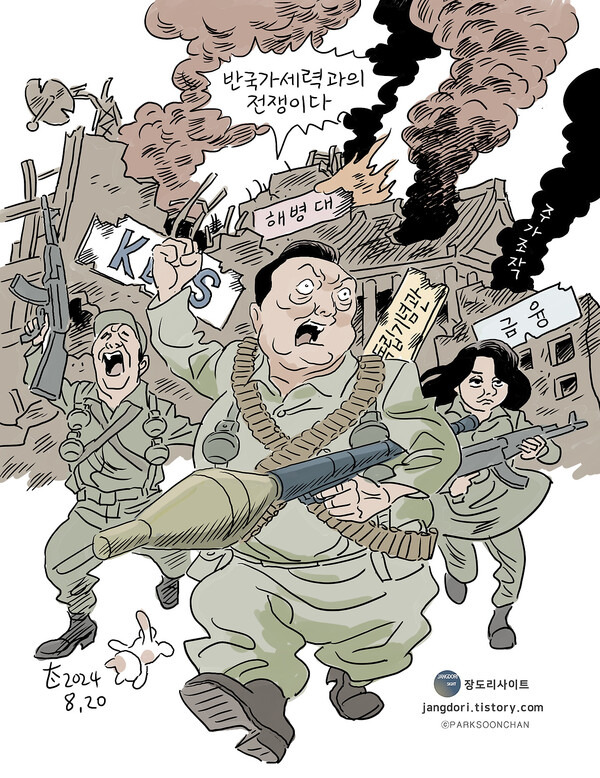 대선후보 윤석열이 손바닥에 새겼던 '왕(王)' 자는 박순찬의 손끝에서 한 획이 빠진 '삼(三)' 자로 바뀌었다. "3년만 버티자"는 왕의 주문은, 그대로 국민의 탄식이 된다. 광복절 경축사에서 반국가세력과의 전쟁을 선포한 헐렁바지는 드디어 8월 20일 만평에서 탄창을 두르고 유탄발사기를 틀어쥐고 진격을 명령한다. 예고였을 뿐이다. 가을 찬바람에 돌연 불어온 '명태균 태풍'은 장님무사가 총을 뽑는 결정적 계기가 된다. 21세기 대한민국 한복판에 기어코 친위쿠데타를 재연한 12.3 계엄은 여전히 진행 중이다. 언젠가 박순찬의 또 다른 카툰집으로 되돌아봐야 할 현재사다.