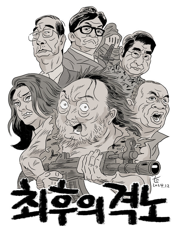 비상계엄 다음 날(12.4.)부터 지난 2월 10일까지를 기록한 비상계엄 선포 다음 날(12.4.)부터 지난 2월 10일까지를 기록한 '최후의 격노'는 무고한 사람들을 매달았던 나무에 매달린 벌거벗은 '내란수괴'의 독백을 전한다. "말 안 듣는 것들 다 쓸어버리고 (김)정은 부럽지 않은 K-킹이 되려 했던 각별한 작전의 실패"를 한탄한다. 곧바로 "하지만 내가 누구냐. 조선 제일의 뒤통수치기 달인이 아닌가. 반드시 재기할 것"이라고 다짐한다.