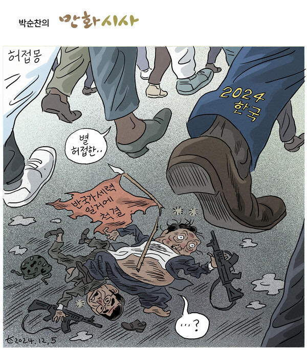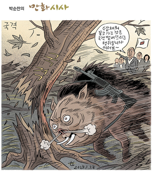 시사만화가 박순찬은 흔들리는 시대의 표정을 기록한다. 대통령 윤석열의 12.3 비상계엄이 선포 이후 헌정 위기 기간이 길어지면서 그의 붓 터치에 갈수록 힘이 실린다. 박순찬은 그러나 큰 목소리로 말하지 않는다. 현실의 긍정과 부정 가운데 하나를 골라 당위로 강요하지도 않는다. 조용히 눌러앉아 관찰하고 그 결과를 화폭에 꾹꾹 담아낼 뿐이다. 한 컷, 한 컷이 모여 시대의 단막극이 되고, 다시 책으로 묶여서 연대기가 된다.