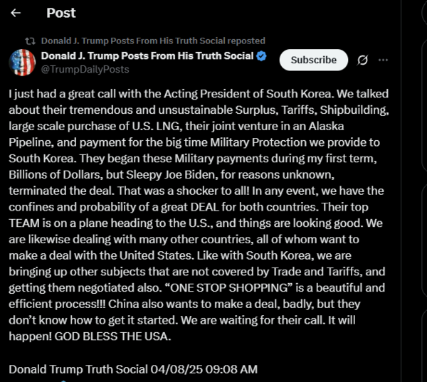 통화 중 '한미 동맹'이 두 번 언급됐고 '북핵'과 '대북정책' '한미일 협력'이 거론됐다는 게 총리실 발표. 그런데 트럼프의 X 계정 글 어디에도 없는 단어들이다. '한미동맹'은 물론 '북한'도 없다. 실제로 통화 중에 관련 이야기가 거론됐을 수 있다. 하지만 적어도 트럼프는 관심이 적었다는 뚜렷한 방증이다. 오죽 메아리가 없었으면 대행이 일방적으로 희망을 피력했겠는가. 외교안보 관련 트럼프의 유일한 언급은 "우리가 한국에 제공하는 막대한 군사적 보호비용 지불"뿐이다. 양측의 주파수가 맞지 않는 통화였다.