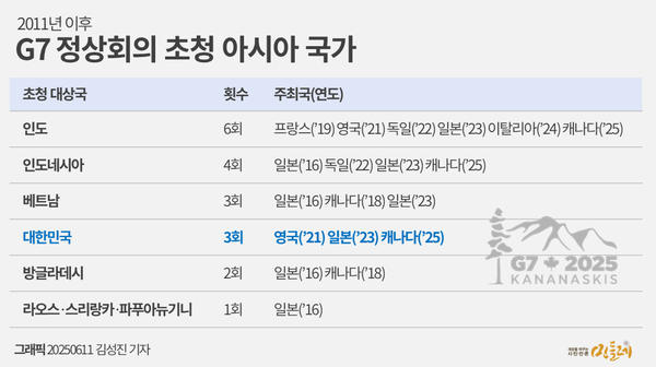 G7 정상회의에 초청됐다고 새삼 감동할 이유는 없다. 벌써 세 번째이거니와 G7은 갈수록 브릭스(BRICs)에 밀리는 '지는 해'이기도 하다. 이번 초청 대상은 7개국 정상과 매번 고정 참석하는 우르줄라 폰데어라이엔 유럽연합(EU) 집행위원장이다. 한국을 비롯해 인도, 인도네시아 등 아시아 국가와 브라질, 멕시코(미주대륙), 남아프리카 공화국(아프리카), 우크라이나 정상이 초청받았다. 캐나다가 '믿음직한 파트너(reliable partners)'로 선택한 국가 정상들과 EU 수장이다. 무함마드 빈살만 사우디아라비아 왕세자도 초청받았지만, 참석 여부가 불투명하다.