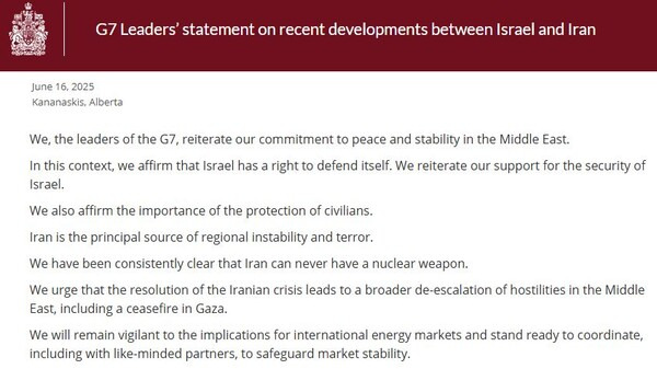 G7 정상은 16일 공동성명을 발표, "우리는 중동의 평화와 안정에 대한 우리의 약속을 되풀이한다"라면서도 이스라엘을 일방적으로 두둔하는 트럼프의 노선에 충실했다. 성명은 "이러한 맥락에서 우리는 이스라엘의 자위권을 인정하며, 이스라엘의 안보에 대한 지지"를 거듭 강조했다. 민간인 보호의 중요성을 강조한 뒤 "이란은 지역 불안정과 테러의 주요 원천"이라고 규정하고 "우리는 이란이 결코 핵무기를 가질 수 없다는 명확성을 일관되게 유지해 왔다"고 강조했다.