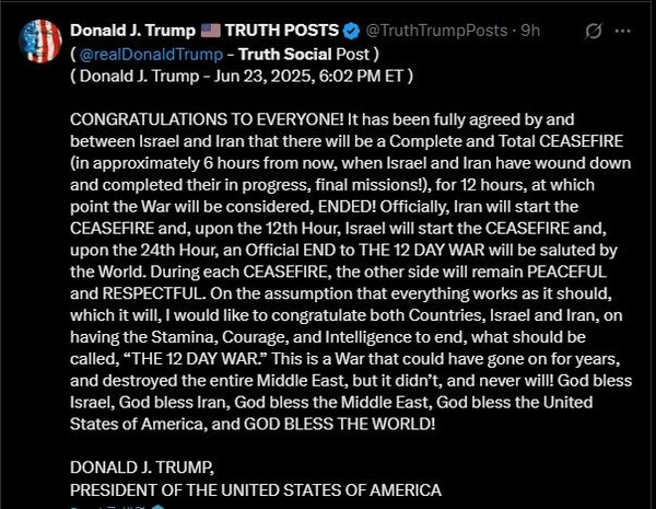 "모두에게 축하를! 이스라엘과 이란이 완전하고 전면적인 휴전에 완전히 동의했다. 12시가 되면 이스라엘은 휴전을 시작하고 24시가 되면 전 세계가 전쟁의 공식 종료에 경례할 거다." (23일 미 동부시간 06시 2분, X 계정)